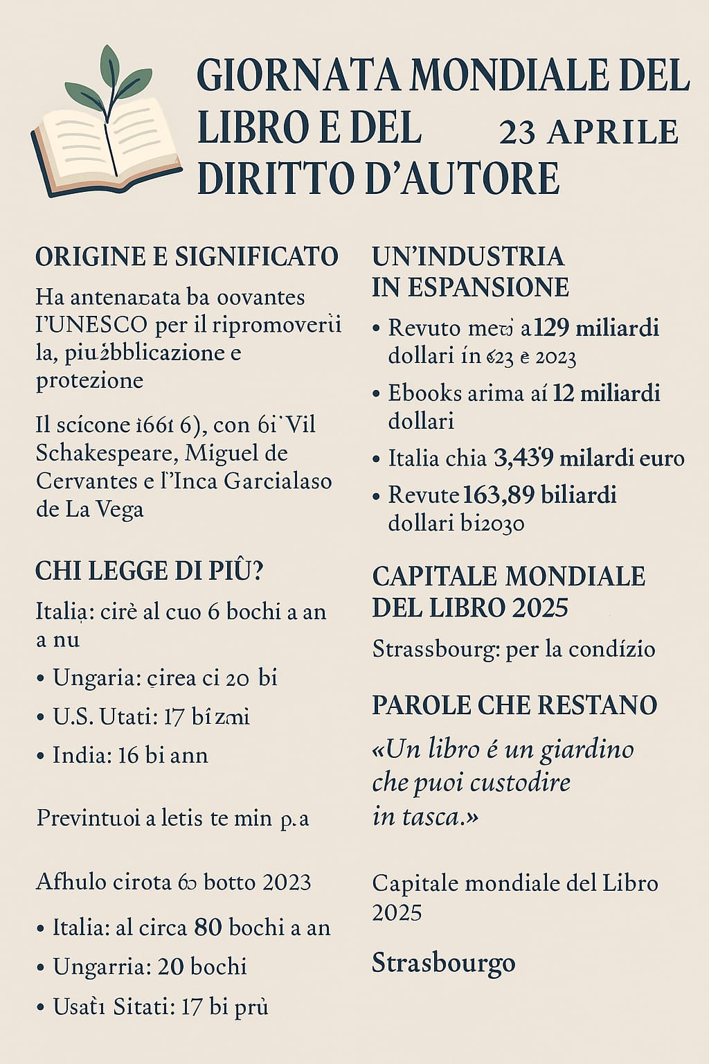 Il 23 aprile di ogni anno si celebra in tutto il mondo la Giornata Mondiale del Libro e del Diritto d’Autore, un evento istituito dall’UNESCO nel 1995 per promuovere la lettura, la pubblicazione e la protezione della proprietà intellettuale. Un appuntamento che coinvolge scuole, biblioteche, librerie, istituzioni culturali e lettori di ogni età.