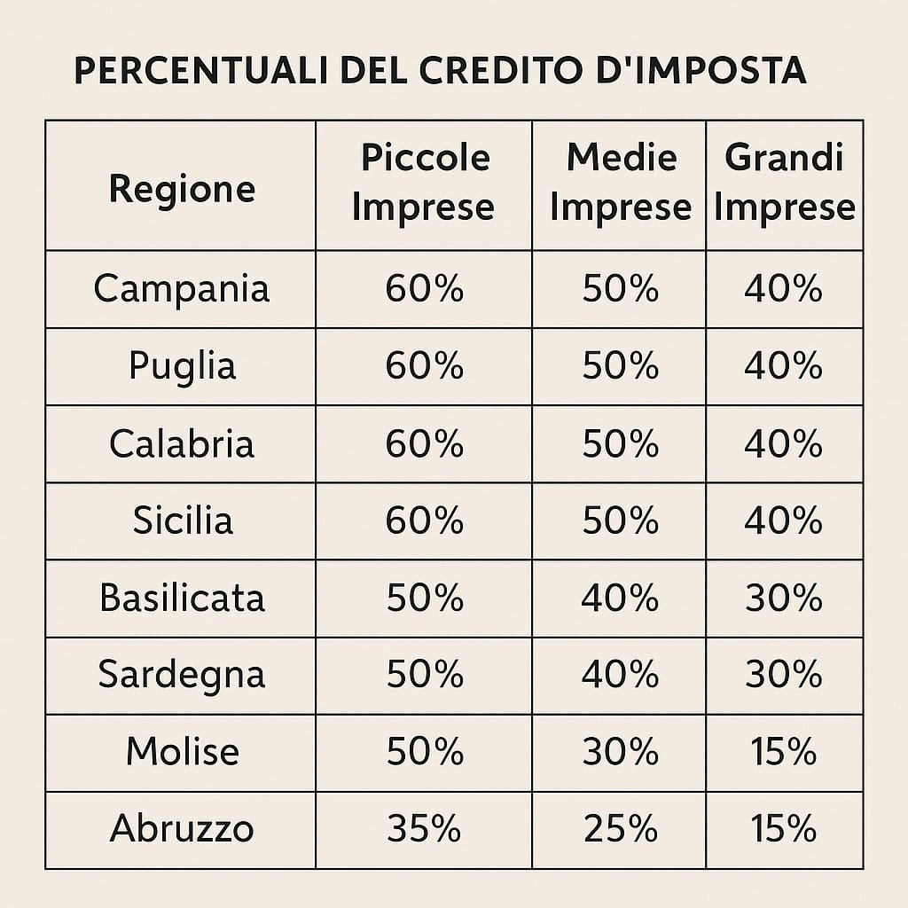 Le percentuali del credito d’imposta sono differenziate secondo la dimensione d’impresa e la regione di investimento, secondo la seguente griglia: