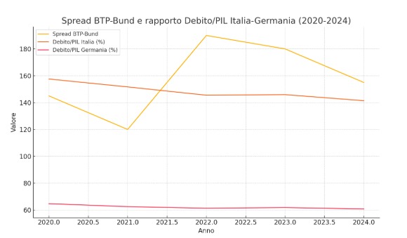Negli ultimi cinque anni, la relazione tra lo spread BTP-Bund, il PIL, il debito pubblico e il rapporto debito/PIL in Italia e Germania ha mostrato dinamiche complesse. Sebbene il rapporto debito/PIL sia un indicatore importante, altri fattori, come le politiche fiscali, la stabilità politica e le decisioni della BCE, hanno avuto un impatto significativo sulla percezione del rischio e, di conseguenza, sullo spread.