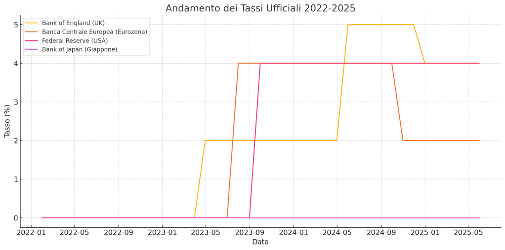Se c’è un elemento che negli ultimi tre anni ha scandito le traiettorie delle economie occidentali, questo è certamente l’evoluzione dei tassi ufficiali. Lontani dalla narrazione superficiale che riduce la politica monetaria a un tecnicismo per addetti ai lavori, i tassi rappresentano oggi la fotografia più nitida delle fratture sistemiche tra i modelli economici globali. È con questo spirito che analizziamo, con lente critica, l’andamento dei tassi della Bank of England (BoE), della Banca Centrale Europea (BCE), della Federal Reserve (Fed) e della Bank of Japan (BoJ).